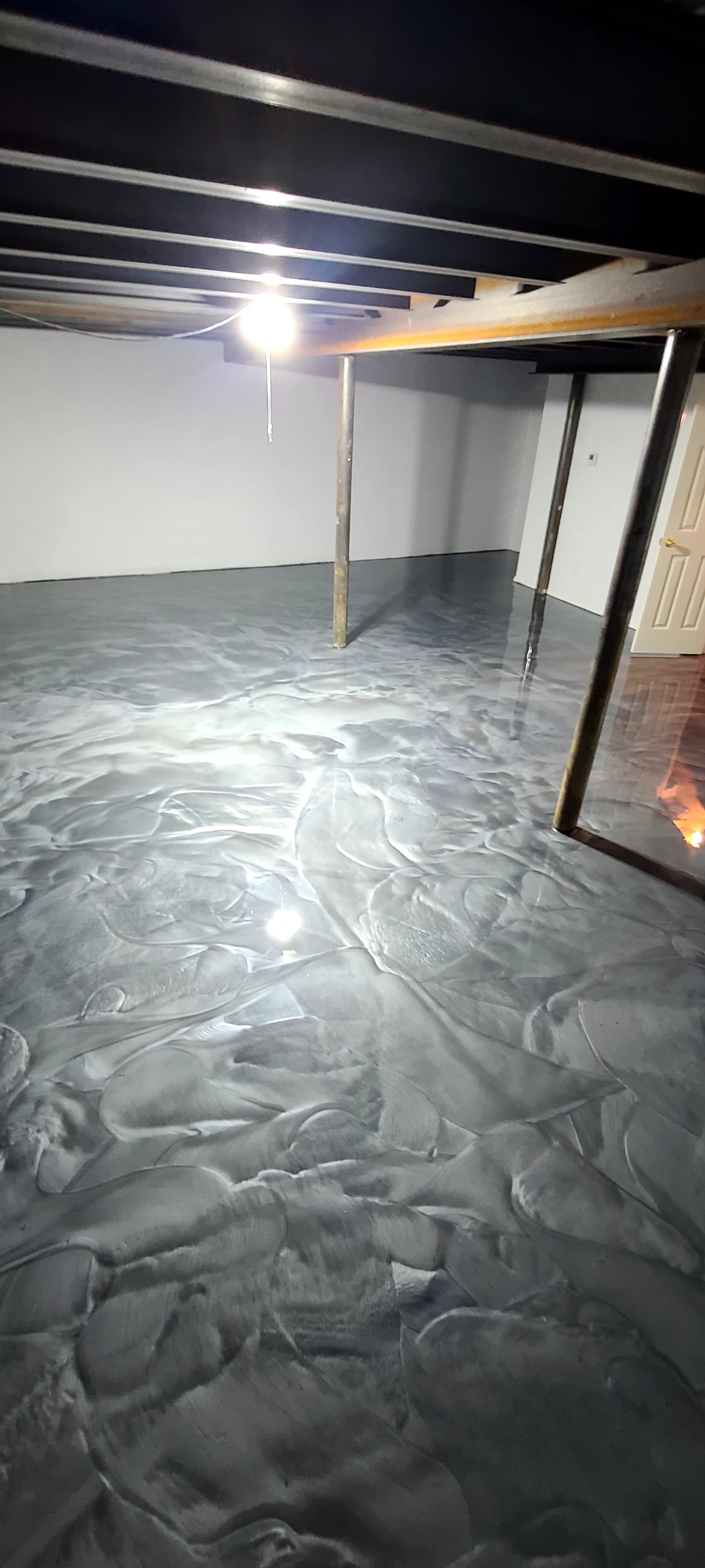 New SHIMMER FINISH polymer flooring available! Solid color tint added to finish coat for a reflective sheen! Note, swirls in pics below are reflections from available lighting.